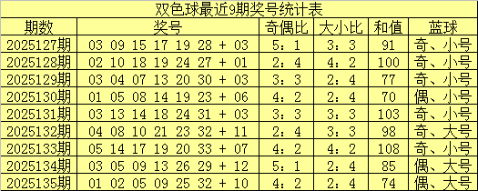 奇偶比:上期红球奇偶比为4:2,其中奇号红球明显较热,最近9期红球奇偶比为32:22,奇数红球表现较热,本期看好奇数红球继续走热,预计奇偶比为4:2。